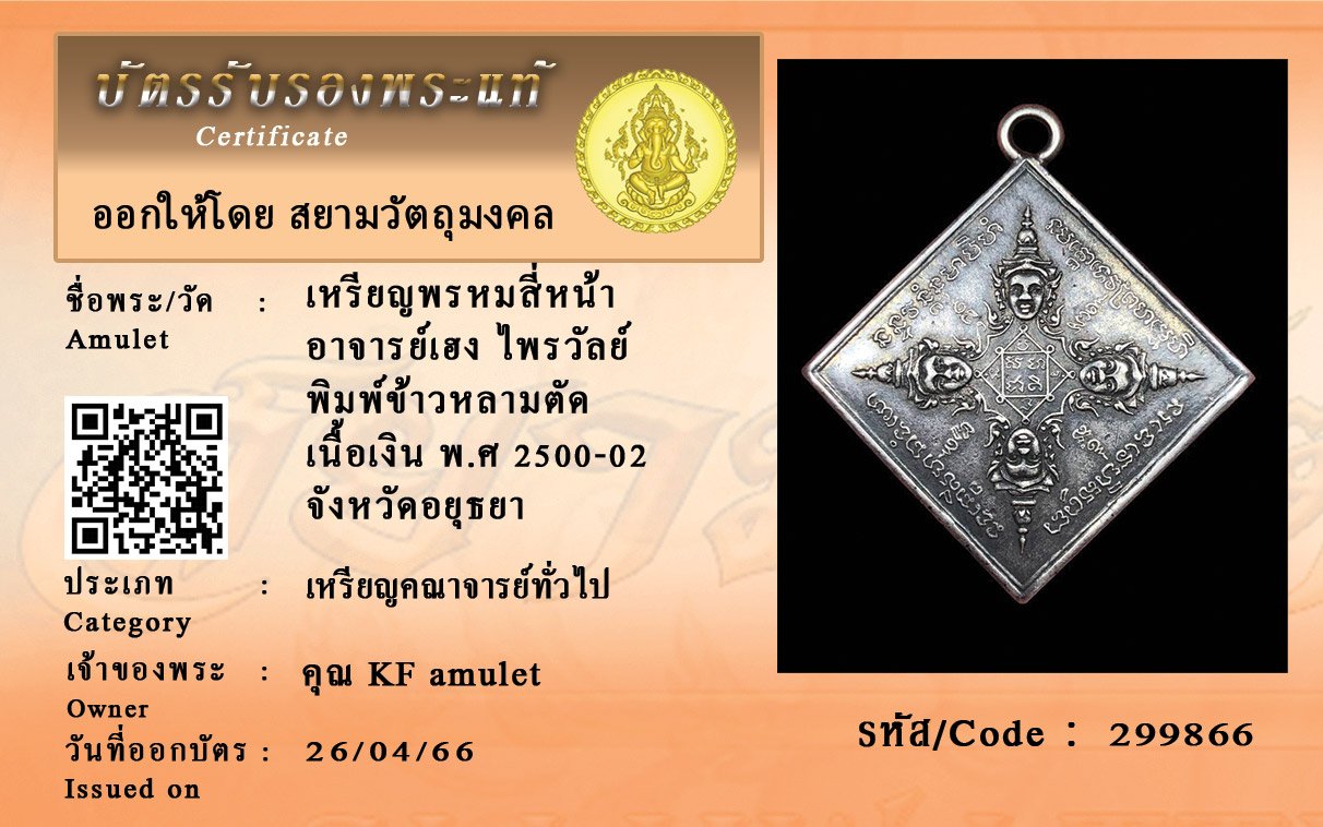 รหัสสินค้า : 299866 เหรียญพรหมสี่หน้า อาจารย์เฮง ไพรวัลย์ พิมพ์ข้าวหลามตัด เนื้อเงิน พ.ศ 2500-02 จังหวัดอยุธยา