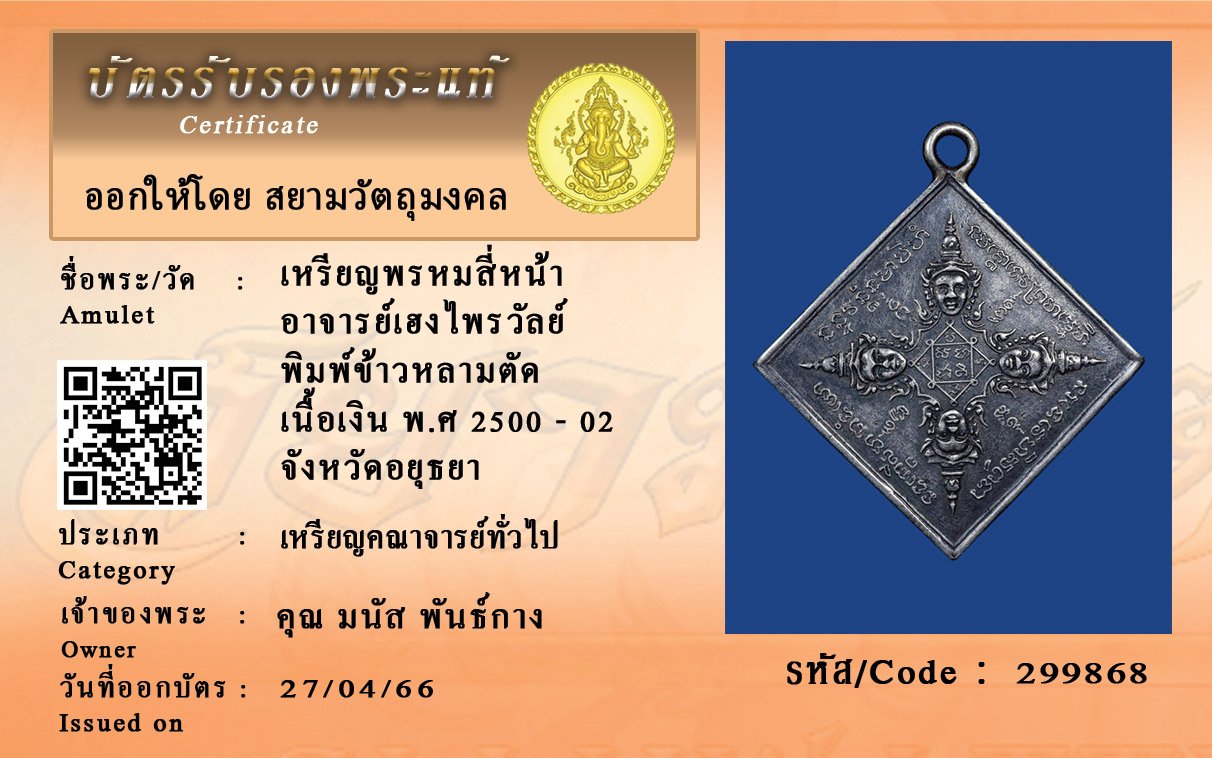 รหัสสินค้า : 299868 เหรียญพรหมสี่หน้า อาจารย์เฮงไพรวัลย์ พิมพ์ข้าวหลามตัด เนื้อเงิน พ.ศ 2500 - 02 จังหวัดอยุธยา