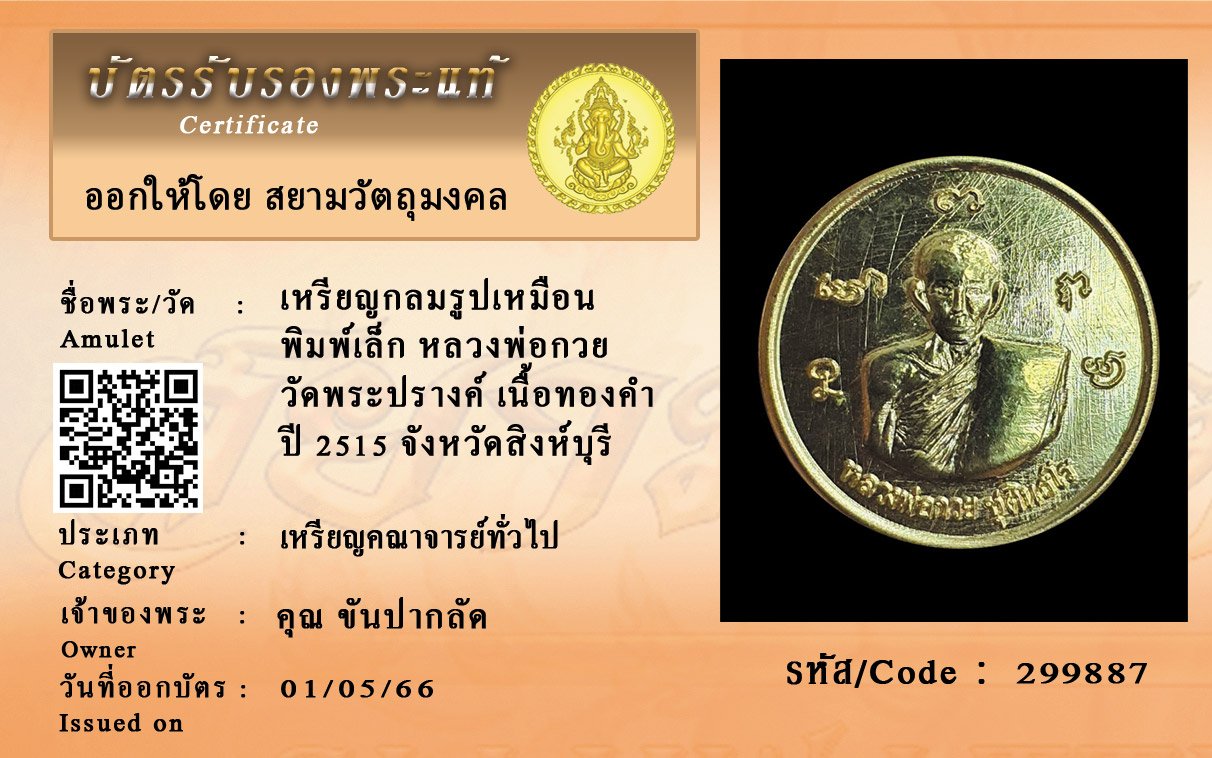 รหัสสินค้า : 299887 เหรียญกลมรูปเหมือน พิมพ์เล็ก หลวงพ่อกวย วัดพระปรางค์ เนื้อทองคำ ปี 2515 จังหวัดสิงห์บุรี