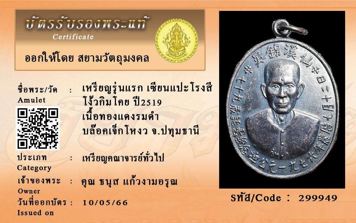 รหัสสินค้า : 299949 เหรียญรุ่นแรก เซียนแปะโรงสี โง้วกิมโคย ปี2519 เนื้อทองแดงรมดำ บล๊อคเจ็กโหงว จ.ปทุมธานี