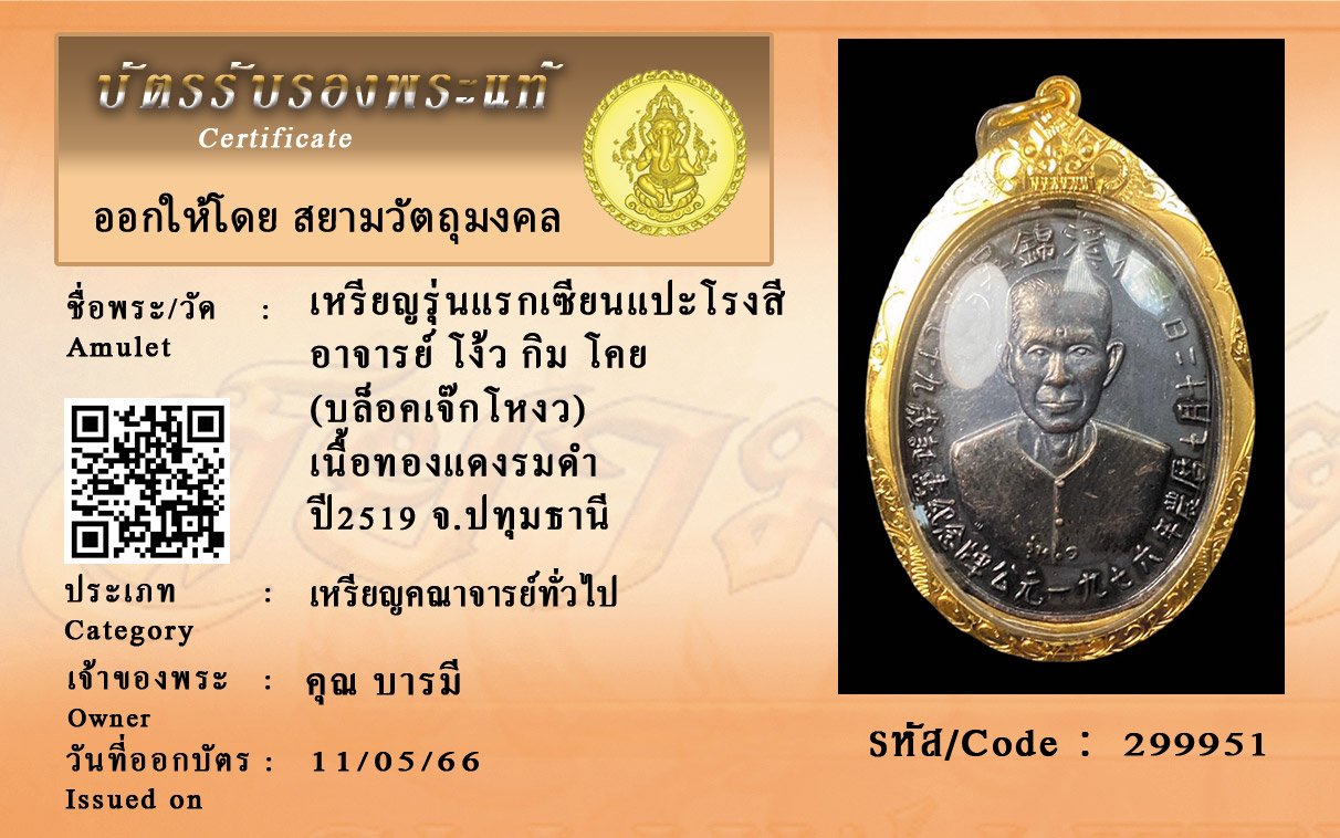รหัสสินค้า : 299951 เหรียญรุ่นแรกเซียนแปะโรงสี อาจารย์ โง้ว กิม โคย (บล็อคเจ๊กโหงว) เนื้อทองแดงรมดำ ปี2519 จ.ปทุมธานี