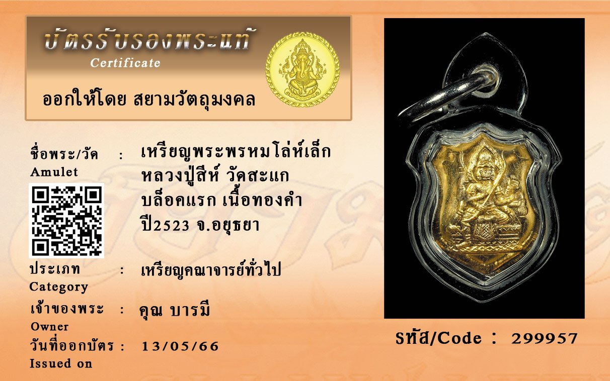 รหัสสินค้า : 299957 เหรียญพระพรหมโล่ห์เล็ก หลวงปู่สีห์ วัดสะแก บล็อคแรก เนื้อทองคำ ปี2523 จ.อยุธยา