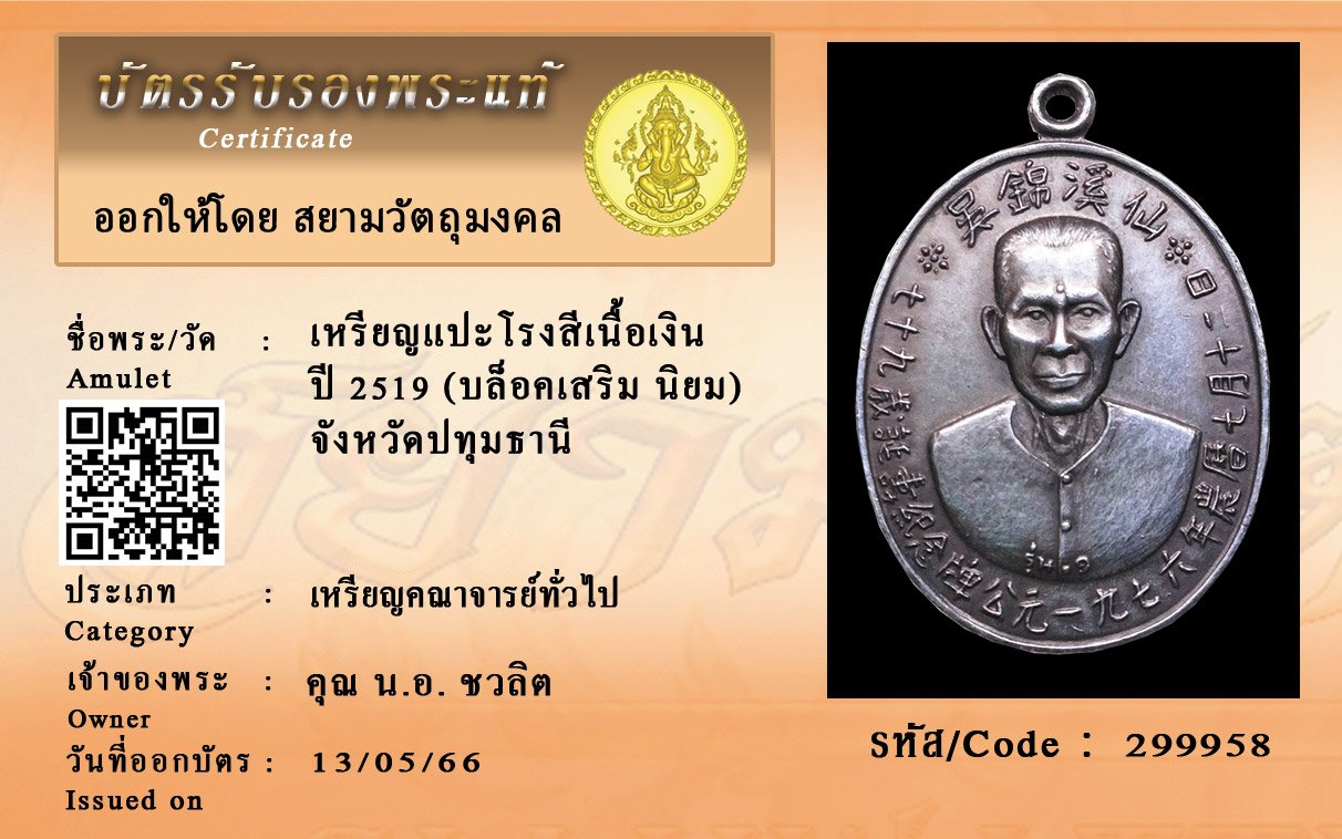 รหัสสินค้า : 299958 เหรียญแปะโรงสีเนื้อเงิน ปี 2519 (บล็อคเสริม นิยม) จังหวัดปทุมธานี