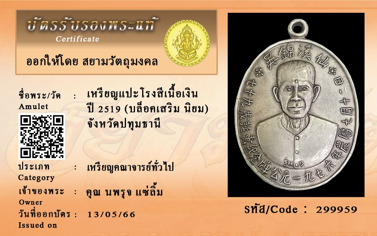 รหัสสินค้า : 299959 เหรียญแปะโรงสีเนื้อเงิน ปี 2519 (บล็อคเสริม นิยม) จังหวัดปทุมธานี