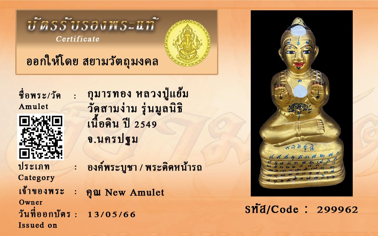 รหัสสินค้า : 299962 กุมารทอง หลวงปู่แย้ม วัดสามง่าม รุ่นมูลนิธิ เนื้อดิน ปี 2549 จ.นครปฐม