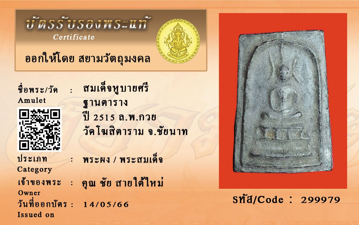 รหัสสินค้า : 299979 สมเด็จหูบายศรี ฐานตาราง ปี 2515 ล.พ.กวย วัดโฆสิตาราม จ.ชัยนาท