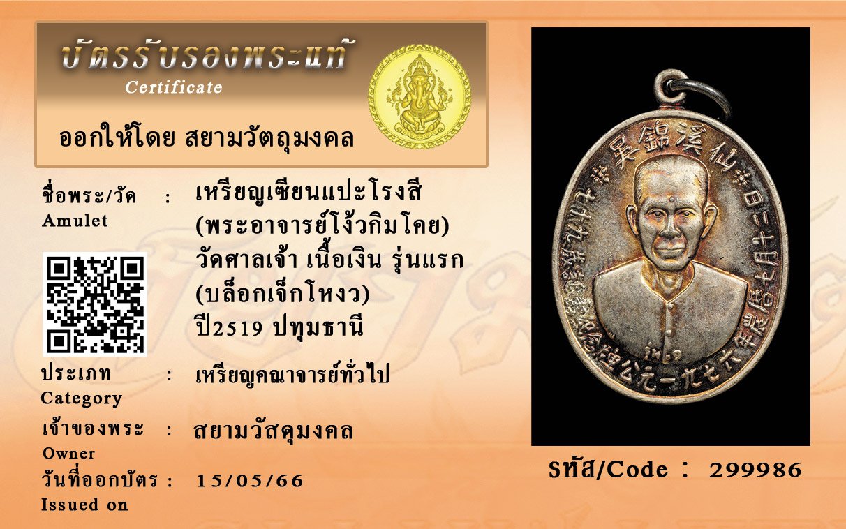 รหัสสินค้า : 299986 เหรียญเซียนแปะโรงสี (พระอาจารย์โง้วกิมโคย) วัดศาลเจ้า เนื้อเงิน รุ่นแรก (บล็อกเจ็กโหงว) ปี2519 ปทุมธานี