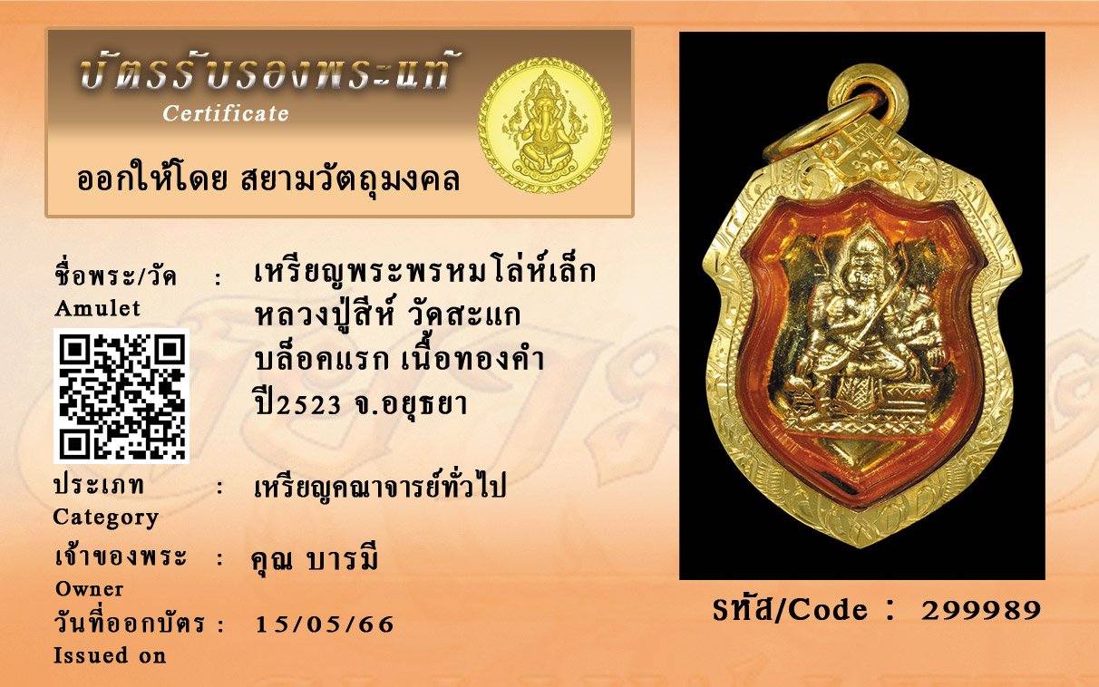 รหัสสินค้า : 299989 เหรียญพระพรหมโล่ห์เล็ก หลวงปู่สีห์ วัดสะแก บล็อคแรก เนื้อทองคำ ปี2523 จ.อยุธยา