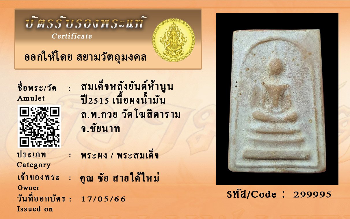 รหัสสินค้า : 299995 สมเด็จหลังยันต์ห้านูน ปี2515.เนื้อผงน้ำมัน ล.พ.กวย วัดโฆสิตาราม จ.ชัยนาท