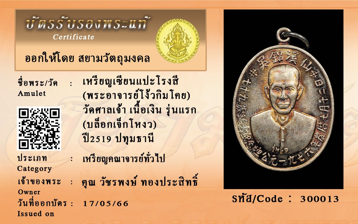 รหัสสินค้า : 300013 เหรียญเซียนแปะโรงสี (พระอาจารย์โง้วกิมโคย) วัดศาลเจ้า เนื้อเงิน รุ่นแรก (บล็อกเจ็กโหงว) ปี2519 ปทุมธานี