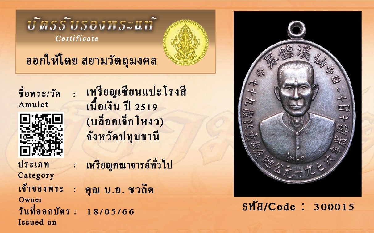 รหัสสินค้า : 300015 เหรียญเซียนแปะโรงสี เนื้อเงิน ปี 2519 (บล็อคเจ็กโหงว) จังหวัดปทุมธานี