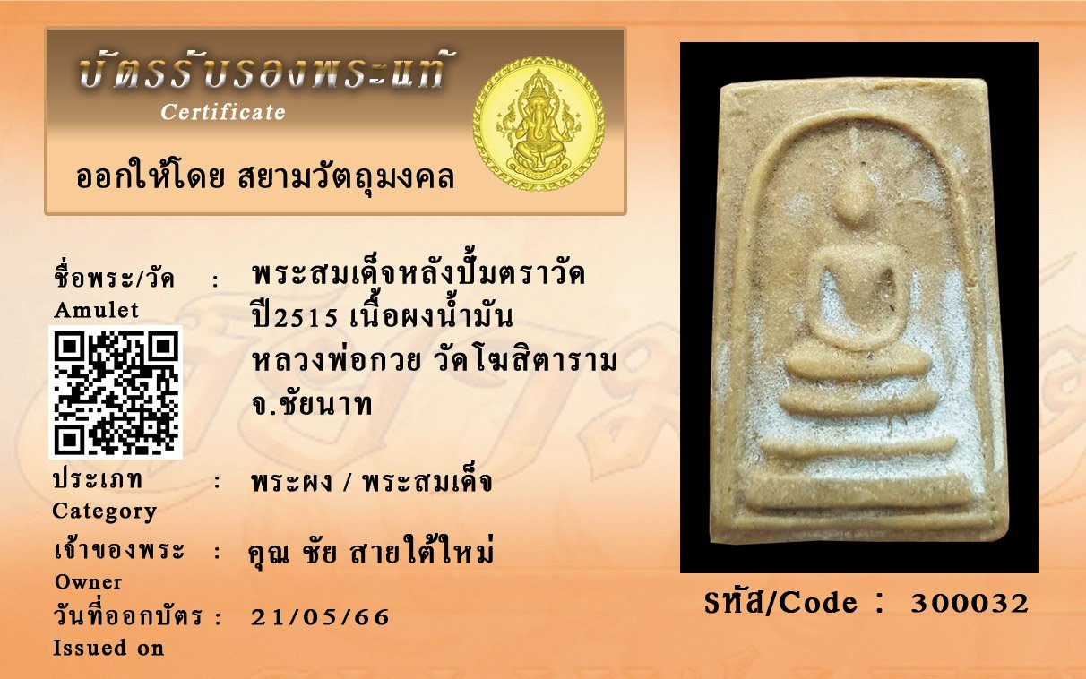รหัสสินค้า : 300032 พระสมเด็จหลังปั้มตราวัด ปี2515 เนื้อผงน้ำมัน หลวงพ่อกวย วัดโฆสิตาราม จ.ชัยนาท