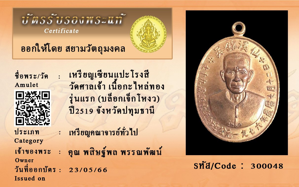 รหัสสินค้า : 300048 เหรียญเซียนแปะโรงสี วัดศาลเจ้า เนื้อกะไหล่ทอง รุ่นแรก (บล็อกเจ็กโหงว) ปี2519 จังหวัดปทุมธานี