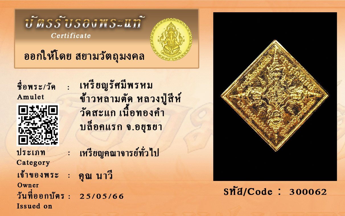 รหัสสินค้า : 300062 เหรียญรัศมีพรหม ข้าวหลามตัด หลวงปู่สีห์ วัดสะแก เนื้อทองคำ บล็อคแรก จ.อยุธยา