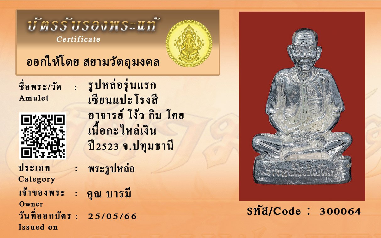 รหัสสินค้า : 300064 รูปหล่อรุ่นแรก เซียนแปะโรงสี อาจารย์ โง้ว กิม โคย เนื้อกะไหล่เงิน ปี2523 จ.ปทุมธานี