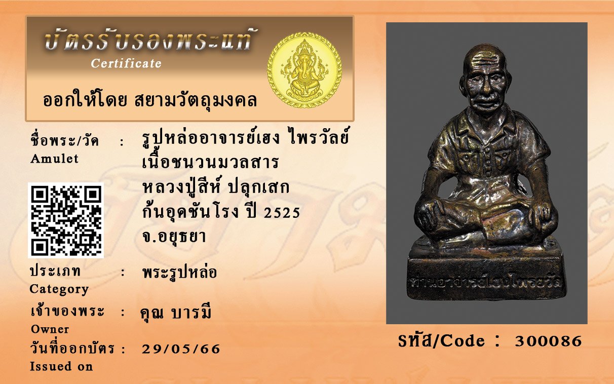 รหัสสินค้า : 300086 รูปหล่ออาจารย์เฮง ไพรวัลย์ เนื้อชนวนมวลสาร หลวงปู่สีห์ ปลุกเสก ก้นอุดชันโรง ปี 2525 จ.อยุธยา