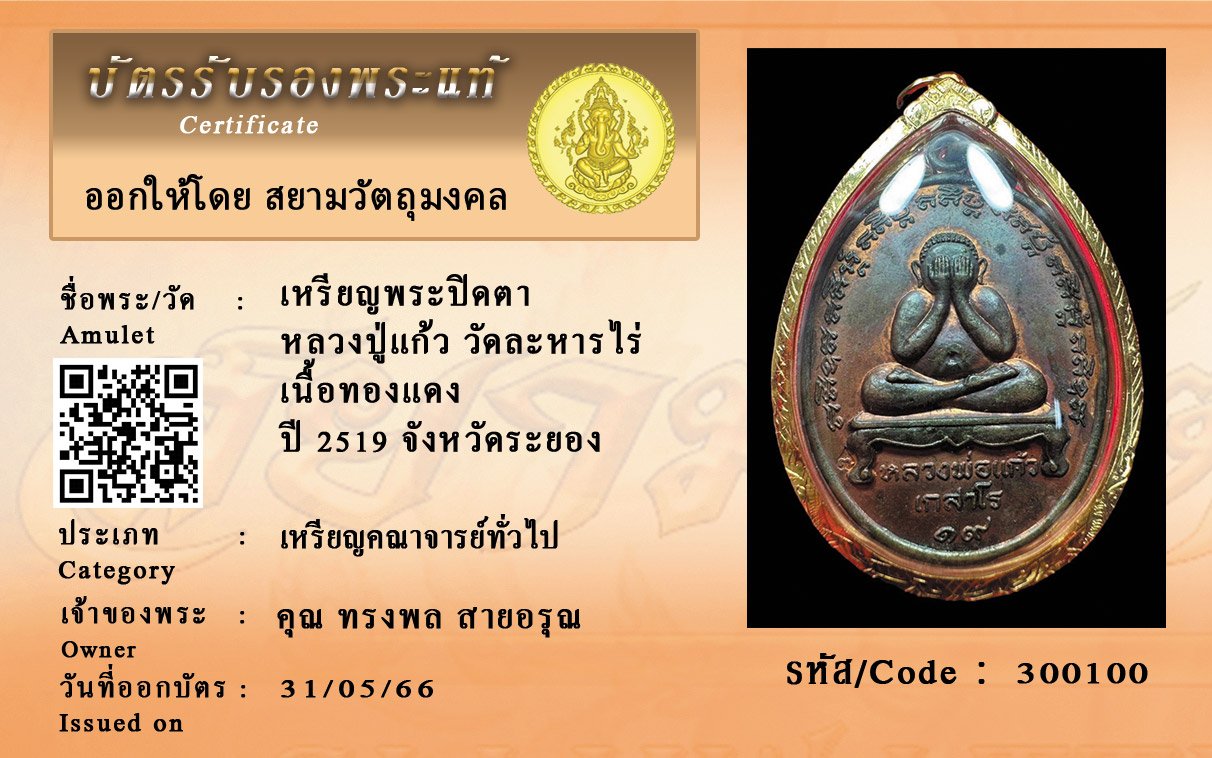 รหัสสินค้า : 300100 เหรียญพระปิดตา หลวงปู่แก้ว วัดละหารไร่ เนื้อทองแดง ปี 2519 จังหวัดระยอง