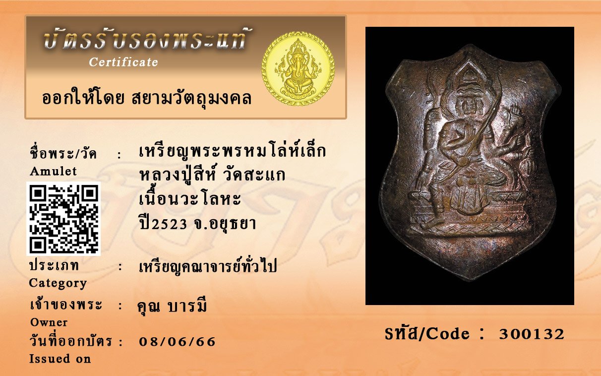 รหัสสินค้า : 300132 เหรียญพระพรหมโล่ห์เล็ก หลวงปู่สีห์ วัดสะแก เนื้อนวะโลหะ ปี2523 จ.อยุธยา