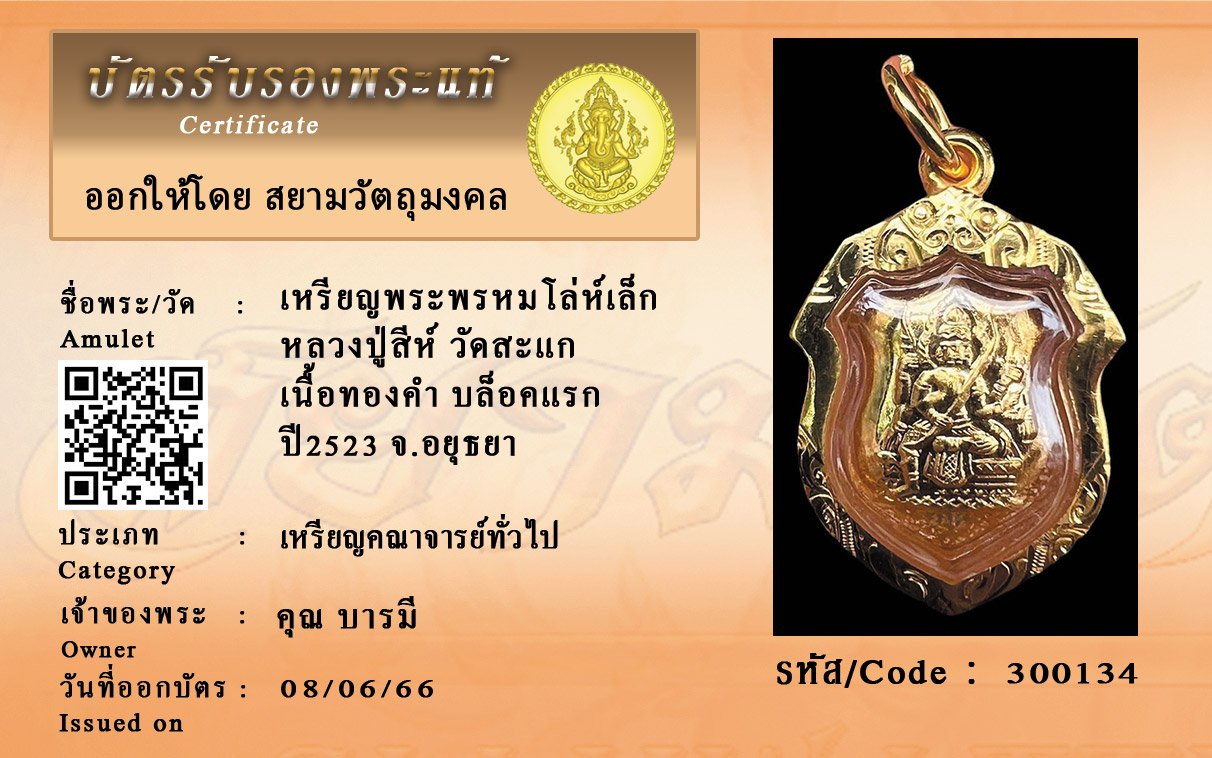รหัสสินค้า : 300134 เหรียญพระพรหมโล่ห์เล็ก หลวงปู่สีห์ วัดสะแก เนื้อทองคำ บล็อคแรก ปี2523 จ.อยุธยา