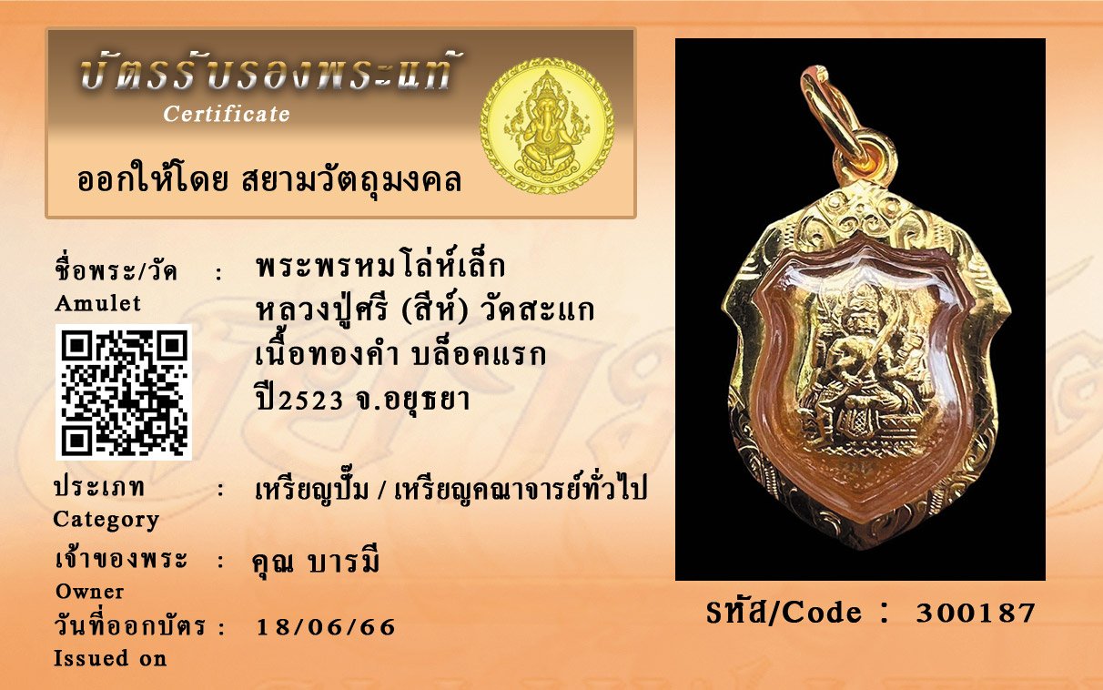 รหัสสินค้า : 300187 พระพรหมโล่ห์เล็ก หลวงปู่ศรี (สีห์) วัดสะแก เนื้อทองคำ บล็อคแรก ปี2523 จ.อยุธยา
