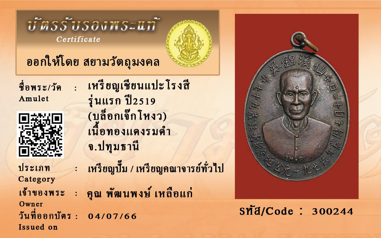 รหัสสินค้า : 300244 เหรียญเชียนแปะโรงสี รุ่นเเรก ปี2519 (บล็อกเจ๊กโหงว) เนื้อทองเเดงรมดำ จ.ปทุมธานี