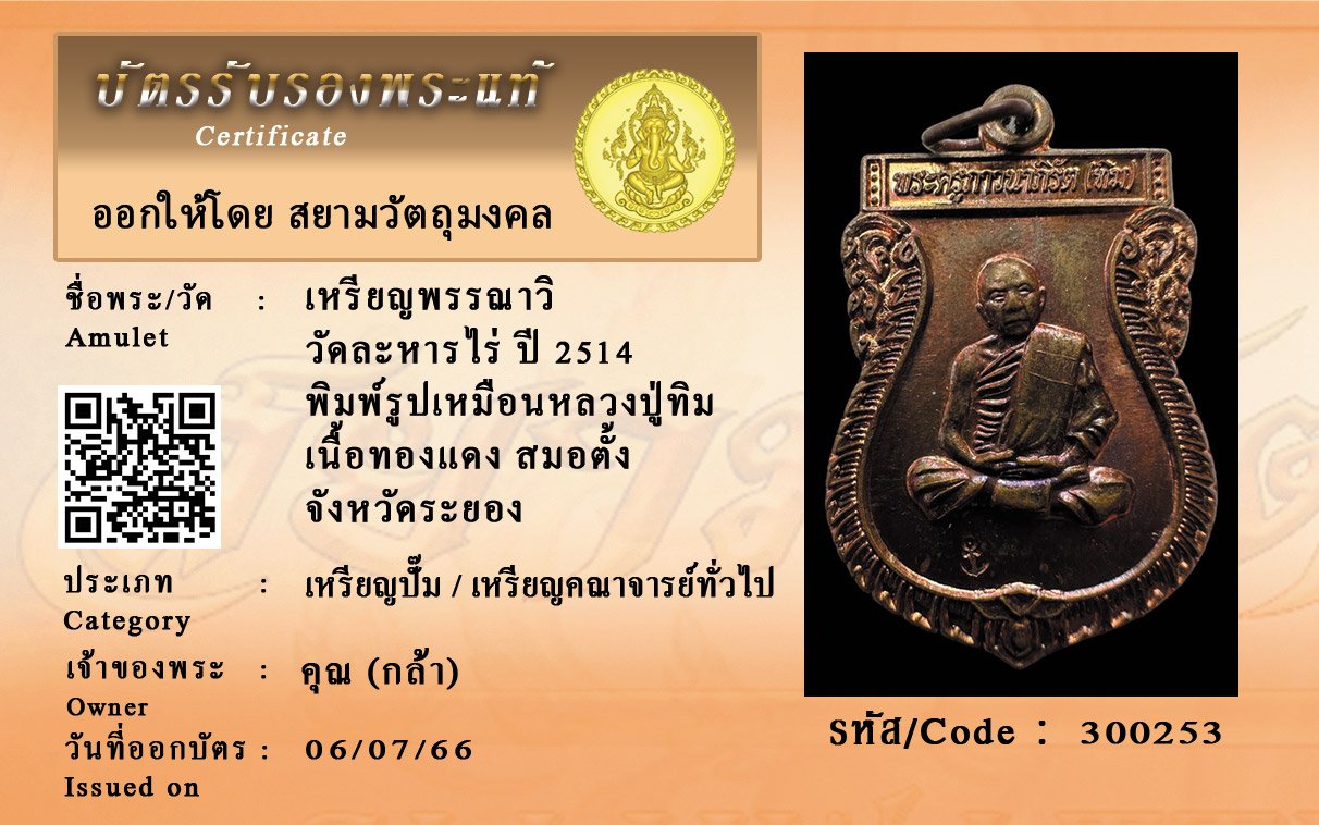 รหัสสินค้า : 300253 เหรียญพรรณาวิ วัดละหารไร่ ปี 2514 พิมพ์รูปเหมือนหลวงปู่ทิม เนื้อทองแดง สมอตั้ง จังหวัดระยอง