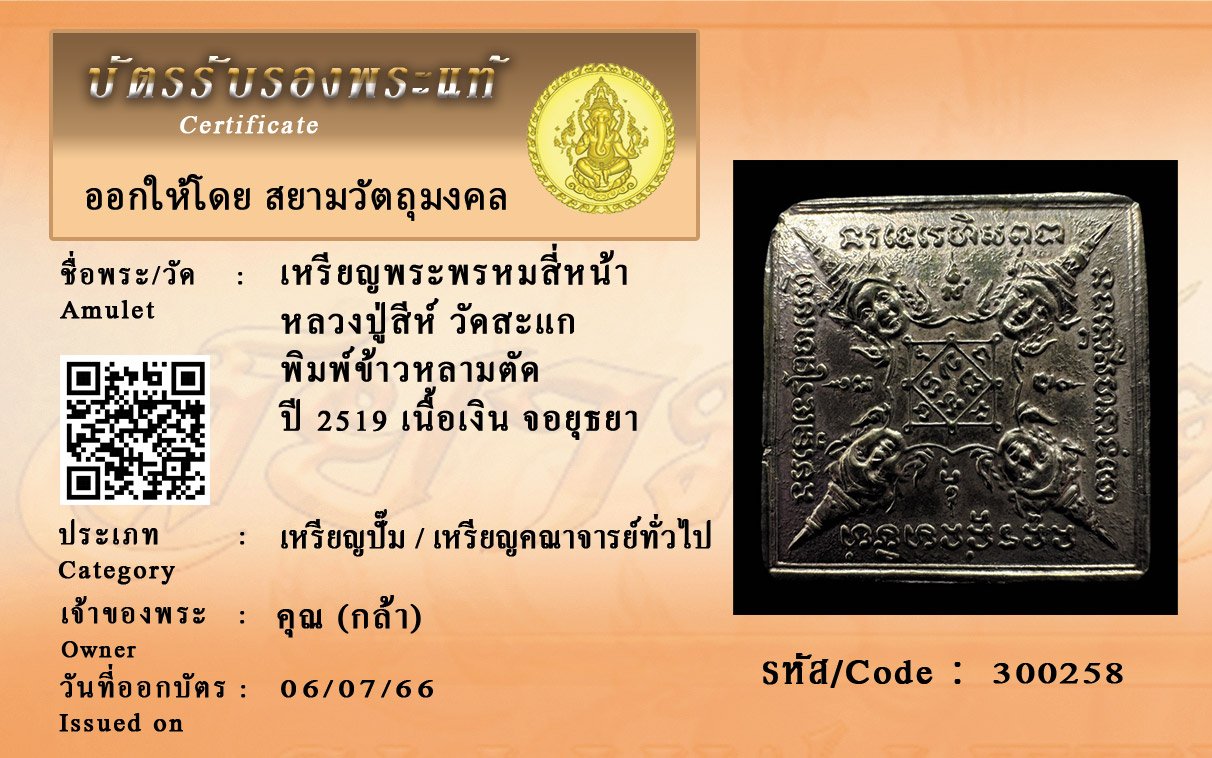 รหัสสินค้า : 300258 เหรียญพระพรหมสี่หน้า หลวงปู่สีห์ วัดสะแก พิมพ์ข้าวหลามตัด ปี 2519 เนื้อเงิน จอยุธยา