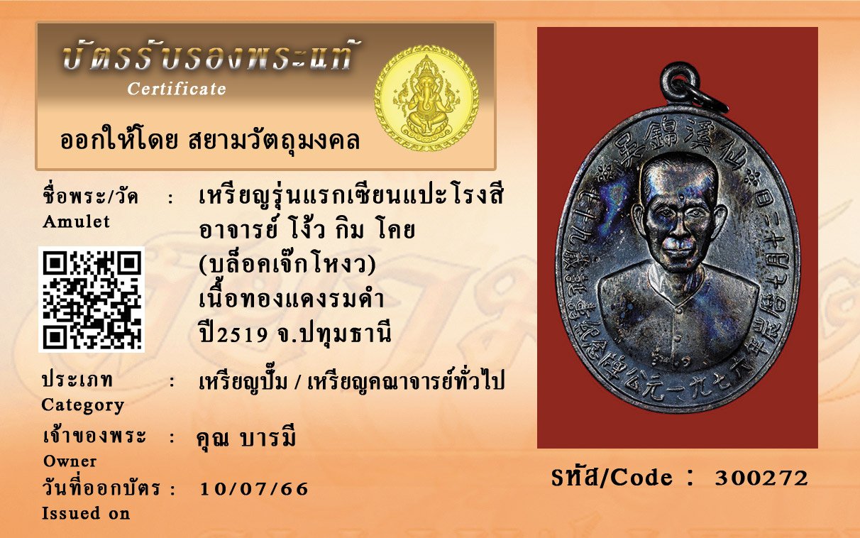 รหัสสินค้า : 300272 เหรียญรุ่นแรกเซียนแปะโรงสี อาจารย์ โง้ว กิม โคย (บล็อคเจ๊กโหงว) เนื้อทองแดงรมดำ ปี2519 จ.ปทุมธานี