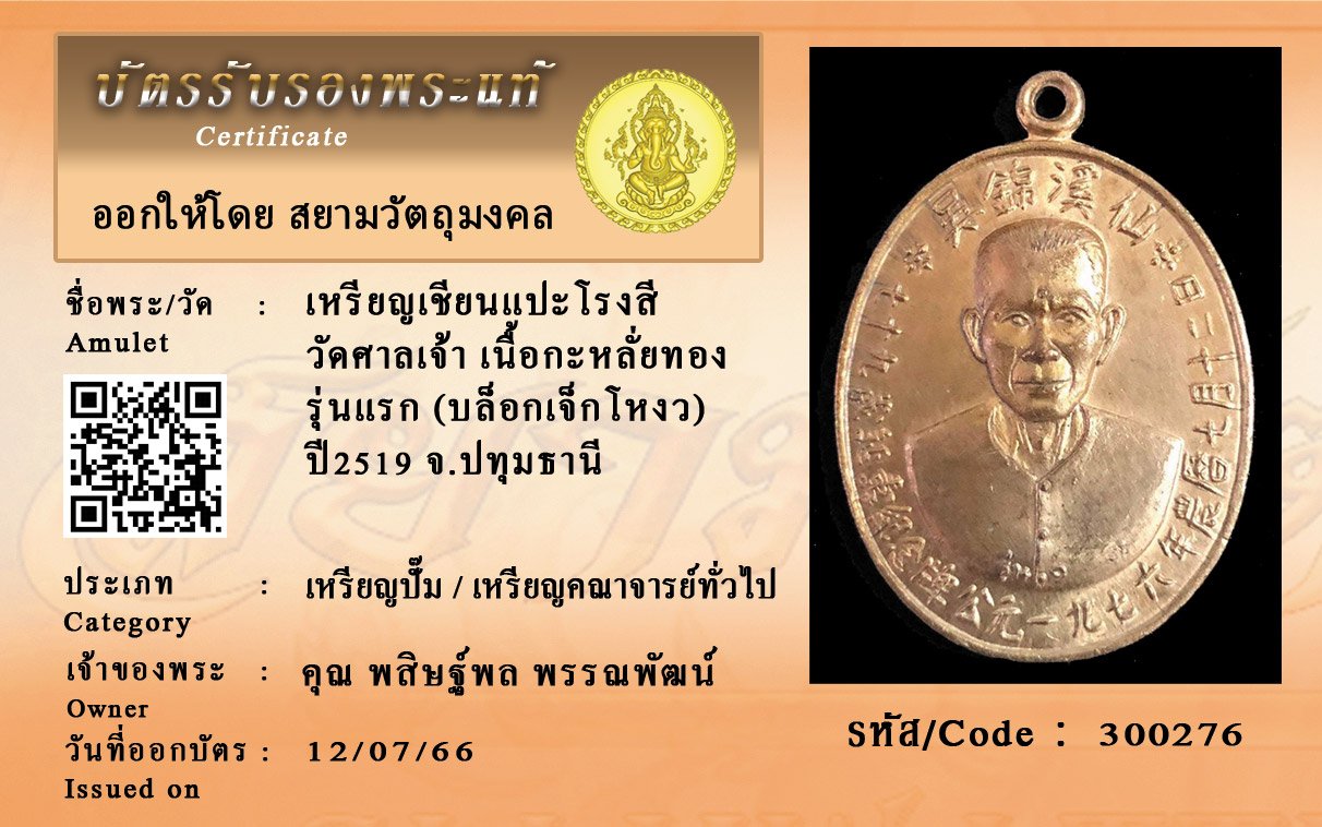 รหัสสินค้า : 300276 เหรียญเชียนแปะโรงสี วัดศาลเจ้า เนื้อกะหลั่ยทอง รุ่นแรก (บล็อกเจ็กโหงว) ปี2519 จ.ปทุมธานี