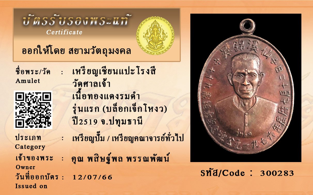 รหัสสินค้า : 300283 เหรียญเชียนแปะโรงสี วัดศาลเจ้า เนื้อทองแดงรมดำ รุ่นแรก (บล็อกเจ็กโหงว) ปี2519 จ.ปทุมธานี