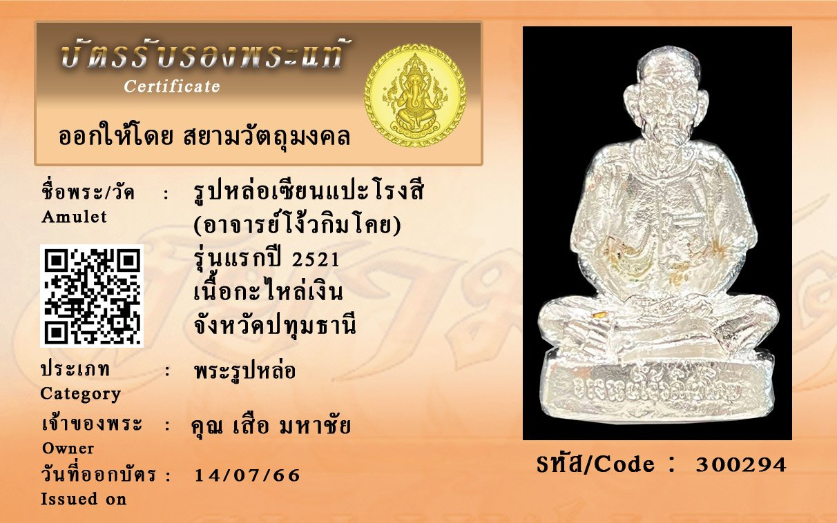 รหัสสินค้า : 300294 รูปหล่อเซียนแปะโรงสี (อาจารย์โง้วกิมโคย) รุ่นแรกปี 2521 เนื้อกะไหล่เงิน จังหวัดปทุมธานี