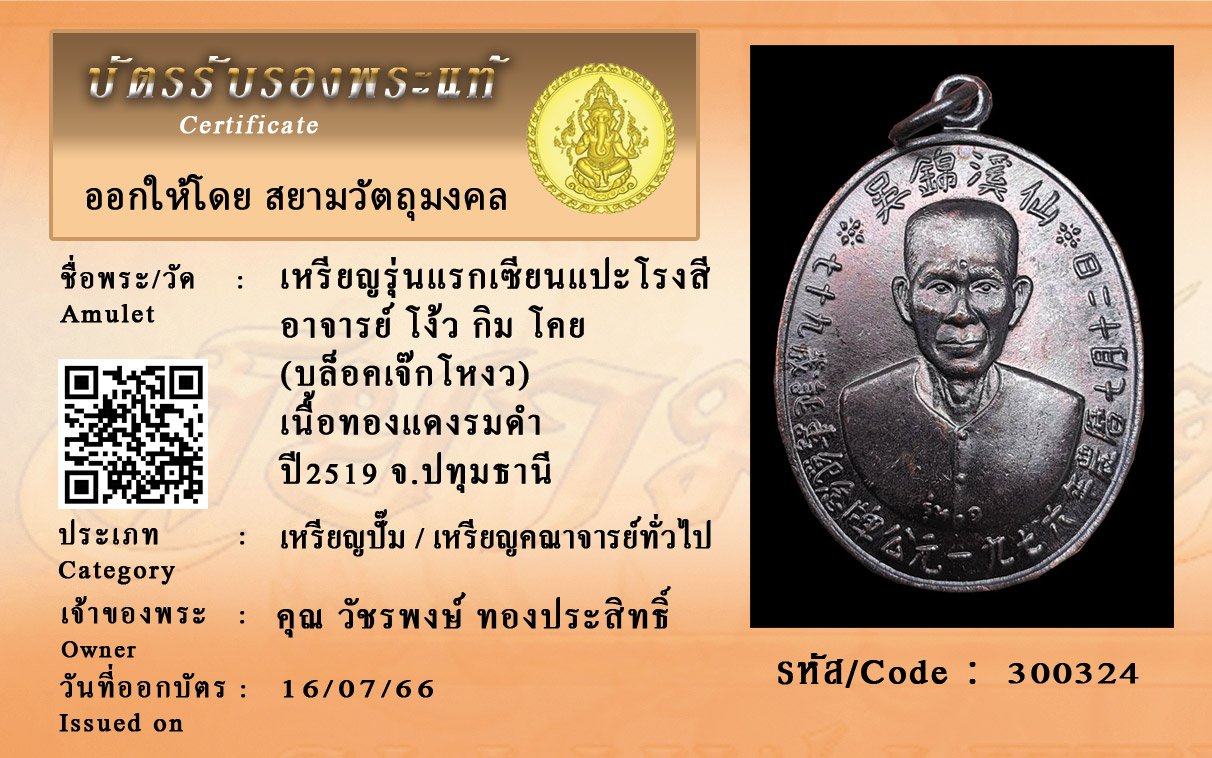 รหัสสินค้า : 300324 เหรียญรุ่นแรกเซียนแปะโรงสี อาจารย์ โง้ว กิม โคย (บล็อคเจ๊กโหงว) เนื้อทองแดงรมดำ ปี2519 จ.ปทุมธานี