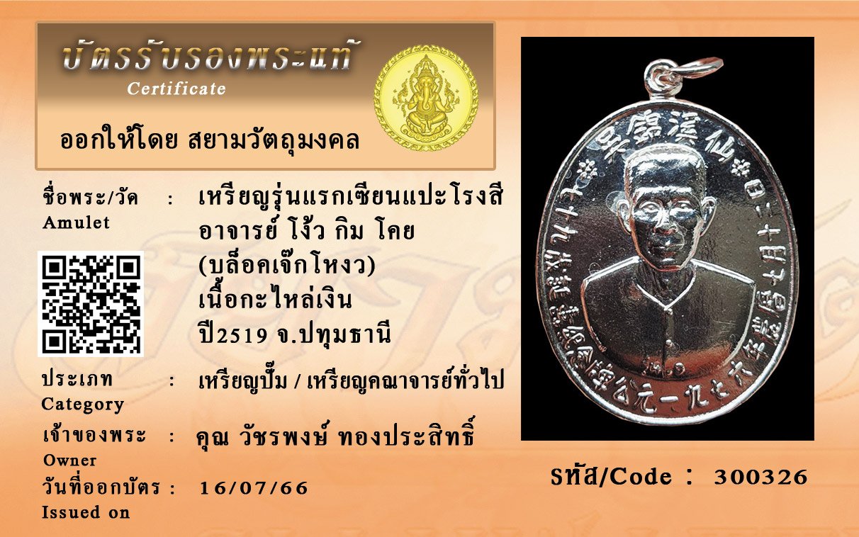 รหัสสินค้า : 300326 เหรียญรุ่นแรกเซียนแปะโรงสี อาจารย์ โง้ว กิม โคย (บล็อคเจ๊กโหงว) เนื้อกะไหล่เงิน ปี2519 จ.ปทุมธานี