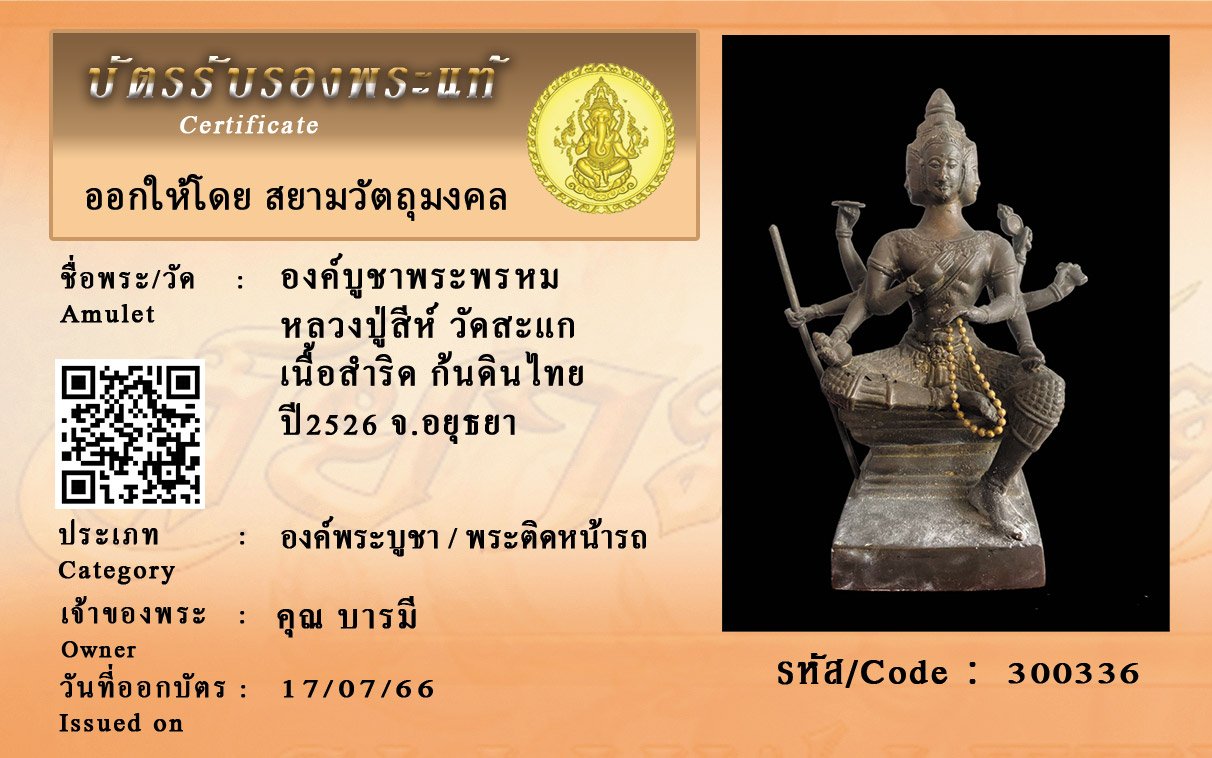 รหัสสินค้า : 300336 องค์บูชาพระพรหม หลวงปู่สีห์ วัดสะแก เนื้อสำริด ก้นดินไทย ปี2526 จ.อยุธยา