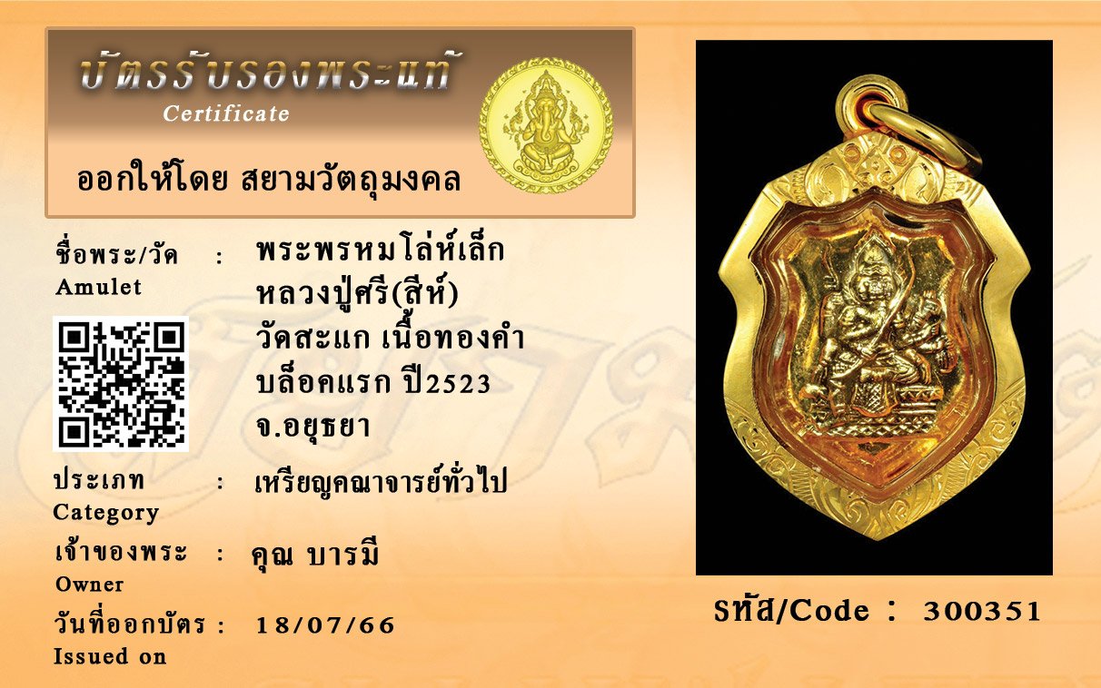 รหัสสินค้า : 300351 พระพรหมโล่ห์เล็ก หลวงปู่ศรี(สีห์) วัดสะแก เนื้อทองคำ บล็อคแรก ปี2523 จ.อยุธยา