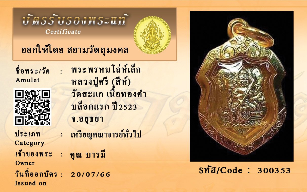 รหัสสินค้า : 300353 พระพรหมโล่ห์เล็ก หลวงปู่ศรี (สีห์) วัดสะแก เนื้อทองคำ บล็อคแรก ปี2523 จ.อยุธยา