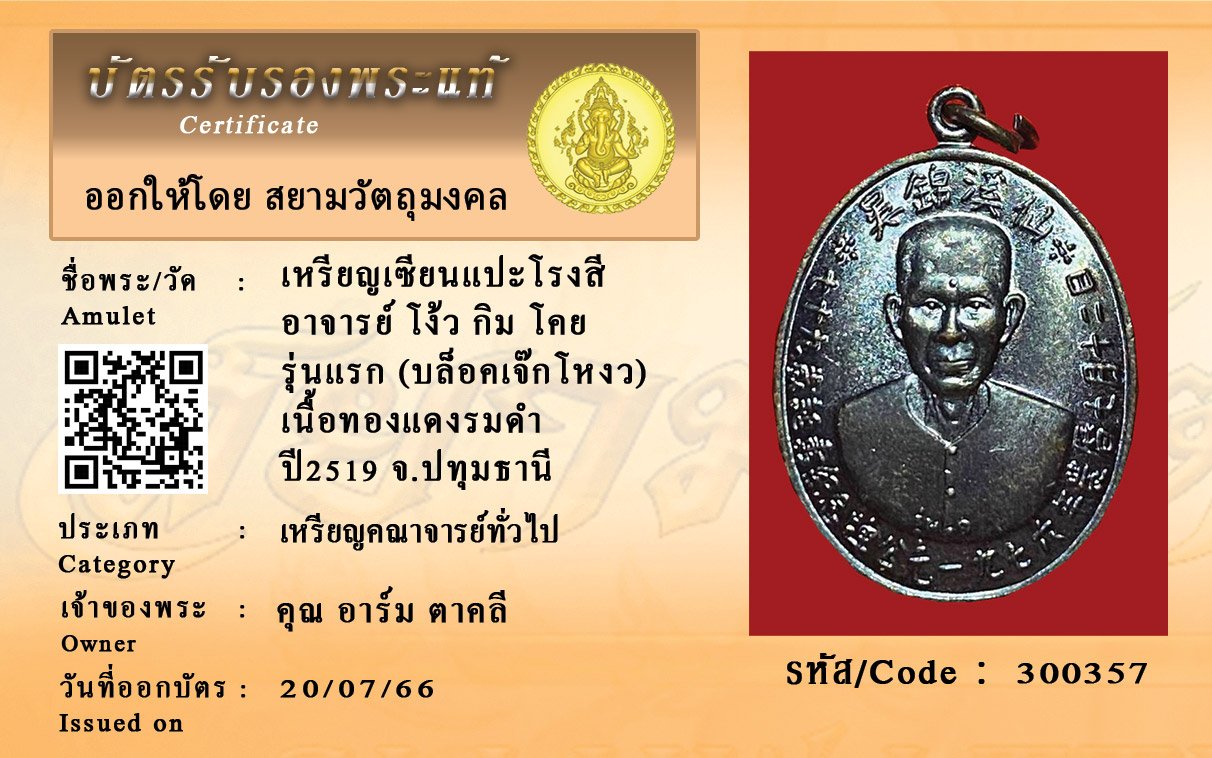 รหัสสินค้า : 300357 เหรียญเซียนแปะโรงสี อาจารย์ โง้ว กิม โคย รุ่นแรก (บล็อคเจ๊กโหงว) เนื้อทองแดงรมดำ ปี2519 จ.ปทุมธานี