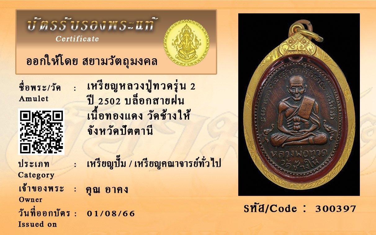 รหัสสินค้า : 300397 เหรียญหลวงปู่ทวดรุ่น 2 ปี 2502 บล็อกสายฝน เนื้อทองแดง วัดช้างให้ จังหวัดปัตตานี