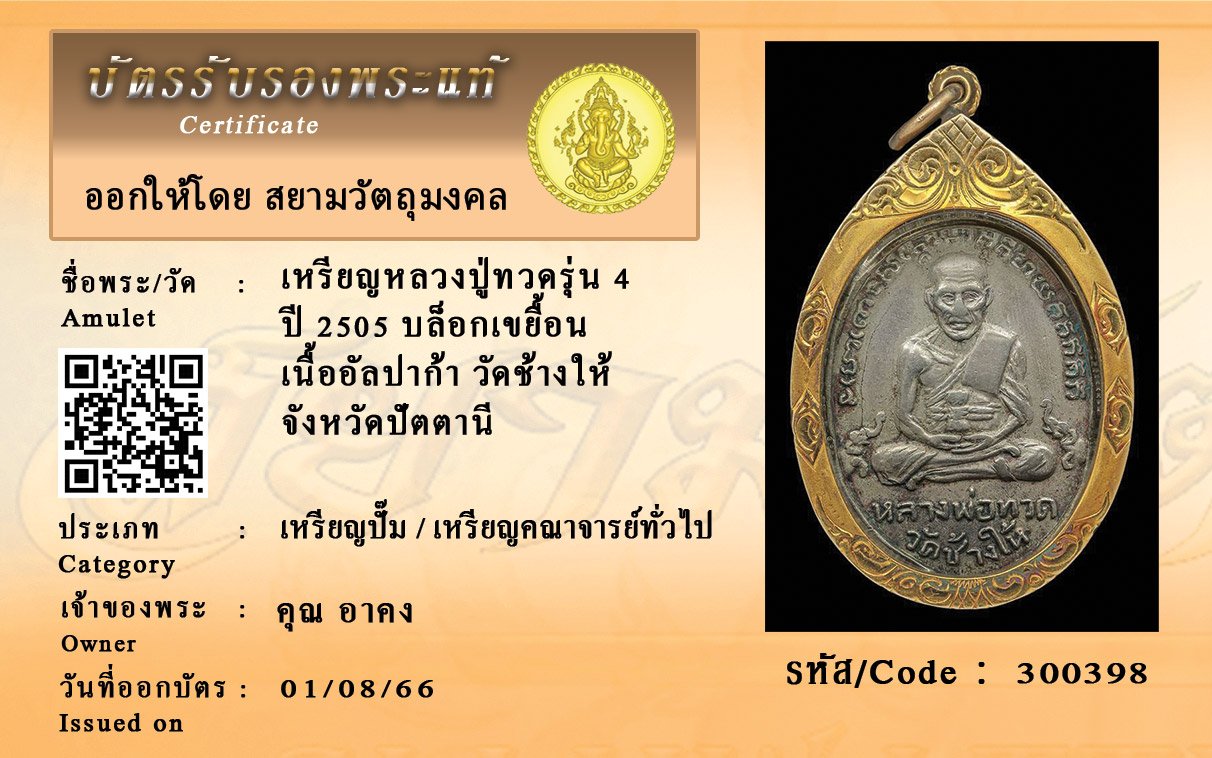 รหัสสินค้า : 300398 เหรียญหลวงปู่ทวดรุ่น 4 ปี 2505 บล็อกเขยื้อน เนื้ออัลปาก้า วัดช้างให้ จังหวัดปัตตานี