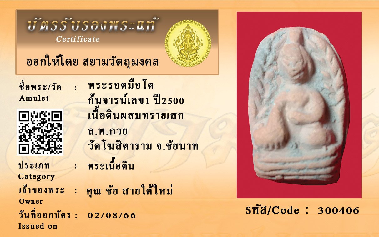 รหัสสินค้า : 300406 พระรอดมือโต ก้นจารน์เลข1 ปี2500 เนื้อดินผสมทรายเสก ล.พ.กวย วัดโฆสิตาราม จ.ชัยนาท