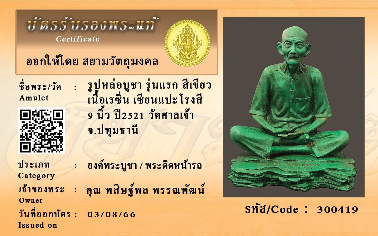 รหัสสินค้า : 300419 รูปหล่อบูชา รุ่นแรก สีเขียว เนื้อเรซิ่น เซียนแปะโรงสี 9 นิ้ว ปี2521 วัดศาลเจ้า จ.ปทุมธานี