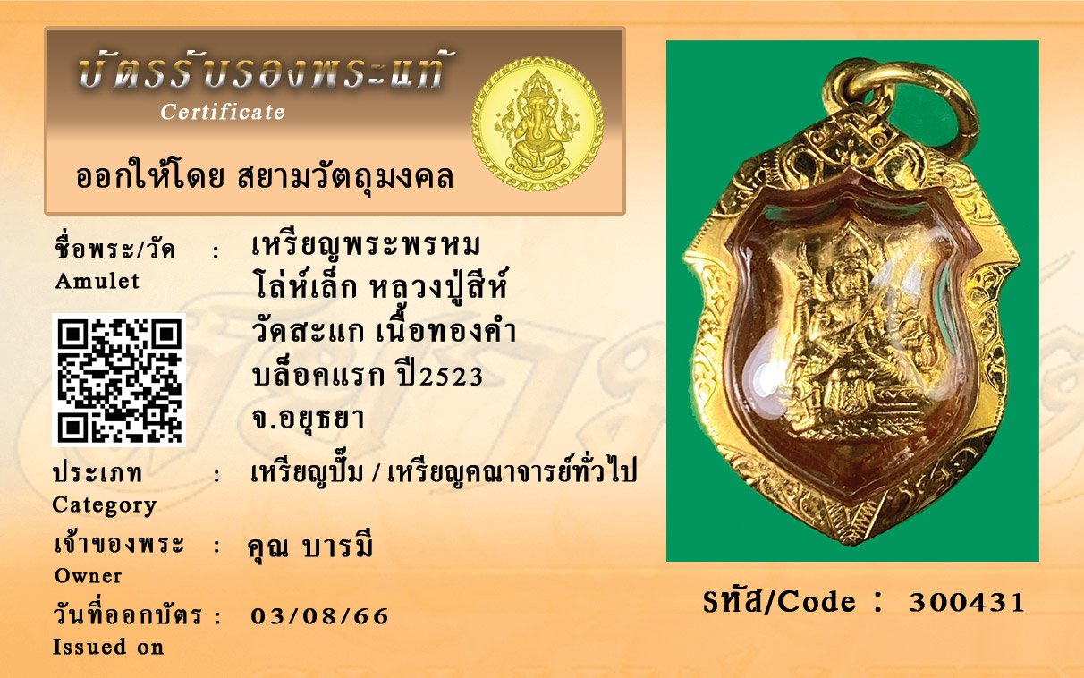 รหัสสินค้า : 300431 เหรียญพระพรหม โล่ห์เล็ก หลวงปู่สีห์ วัดสะแก เนื้อทองคำ บล็อคแรก ปี2523 จ.อยุธยา