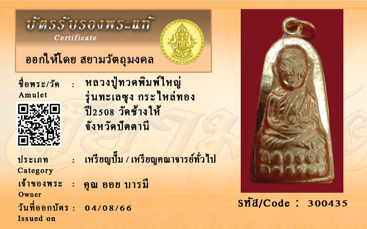 รหัสสินค้า : 300435 หลวงปู่ทวดพิมพ์ใหญ่ รุ่นทะเลซุง กระไหล่ทอง ปี2508 วัดช้างให้ จังหวัดปัตตานี