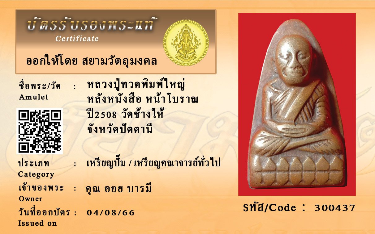รหัสสินค้า : 300437 หลวงปู่ทวดพิมพ์ใหญ่ หลังหนังสือ หน้าโบราณ ปี2508 วัดช้างให้ จังหวัดปัตตานี