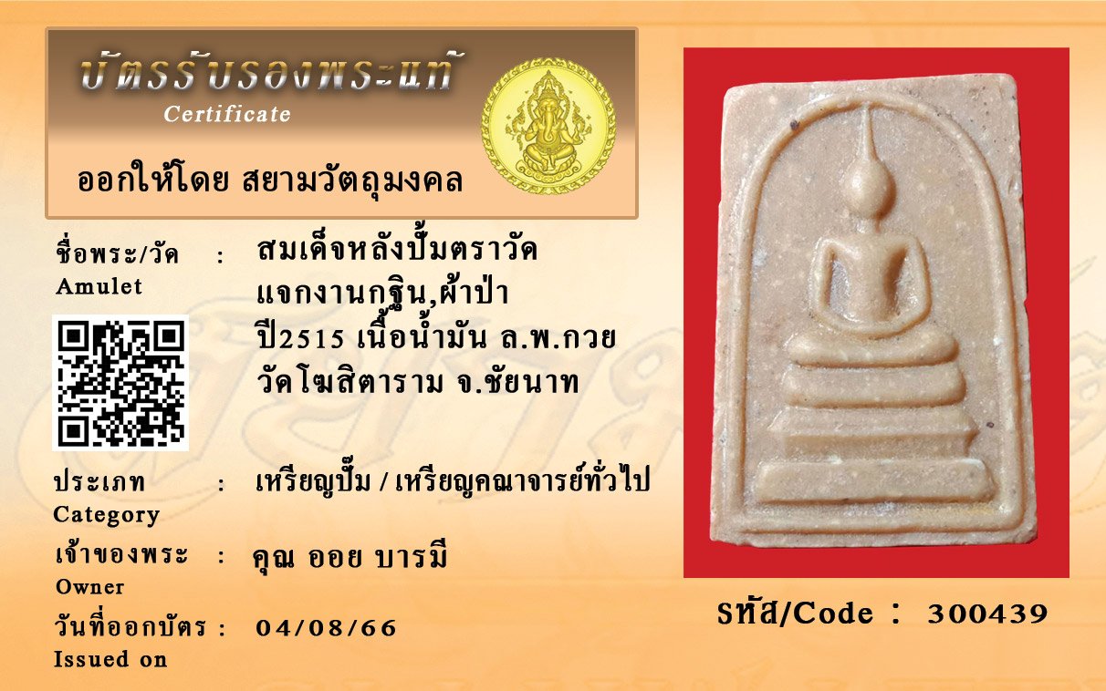 รหัสสินค้า : 300439 สมเด็จหลังปั้มตราวัด แจกงานกฐิน,ผ้าป่า ปี2515 เนื้อน้ำมัน ล.พ.กวย วัดโฆสิตาราม จ.ชัยนาท