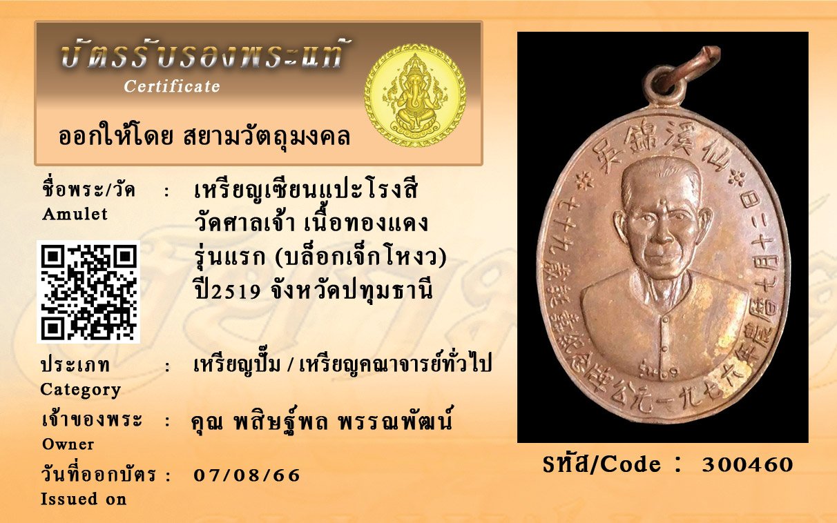 รหัสสินค้า : 300460 เหรียญเซียนแปะโรงสี วัดศาลเจ้า เนื้อทองแดง รุ่นแรก (บล็อกเจ็กโหงว) ปี2519 จังหวัดปทุมธานี