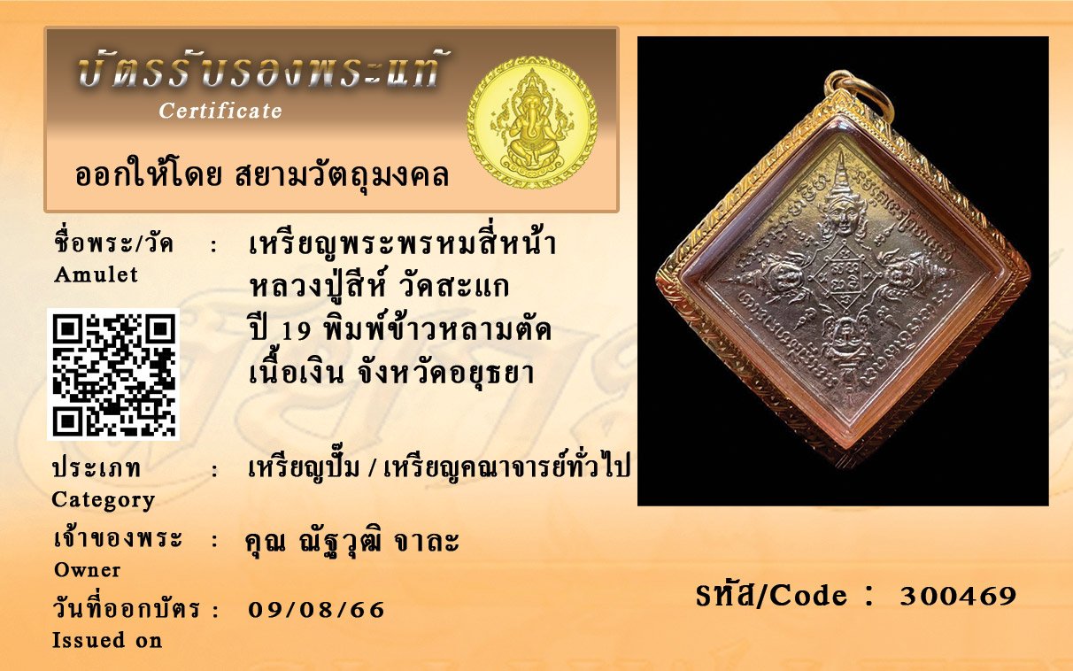 รหัสสินค้า : 300469 เหรียญพระพรหมสี่หน้า หลวงปู่สีห์ วัดสะแก ปี 19 พิมพ์ข้าวหลามตัด เนื้อเงิน จังหวัดอยุธยา