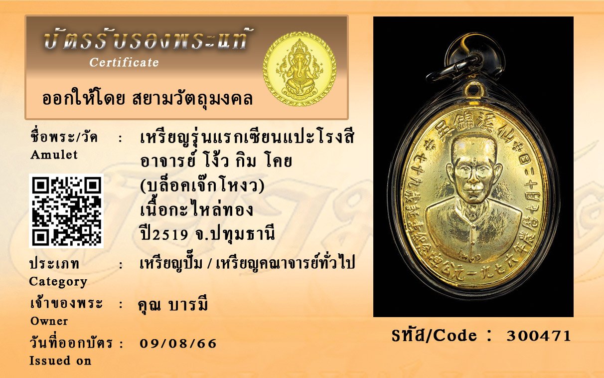 รหัสสินค้า : 300471 เหรียญรุ่นแรกเซียนแปะโรงสี อาจารย์ โง้ว กิม โคย (บล็อคเจ๊กโหงว) เนื้อกะไหล่ทอง ปี2519 จ.ปทุมธานี