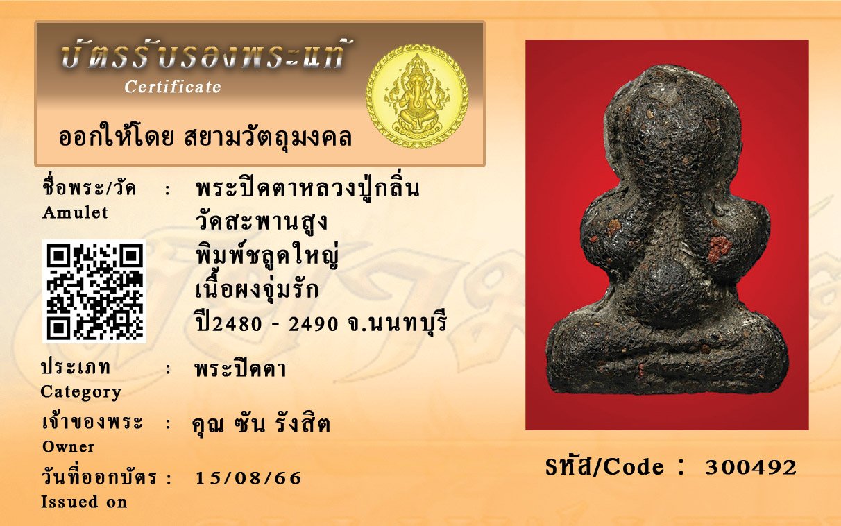รหัสสินค้า : 300492 พระปิดตาหลวงปู่กลิ่น วัดสะพานสูง พิมพ์ชลูดใหญ่ เนื้อผงจุ่มรัก ปี2480 - 2490 จ.นนทบุรี