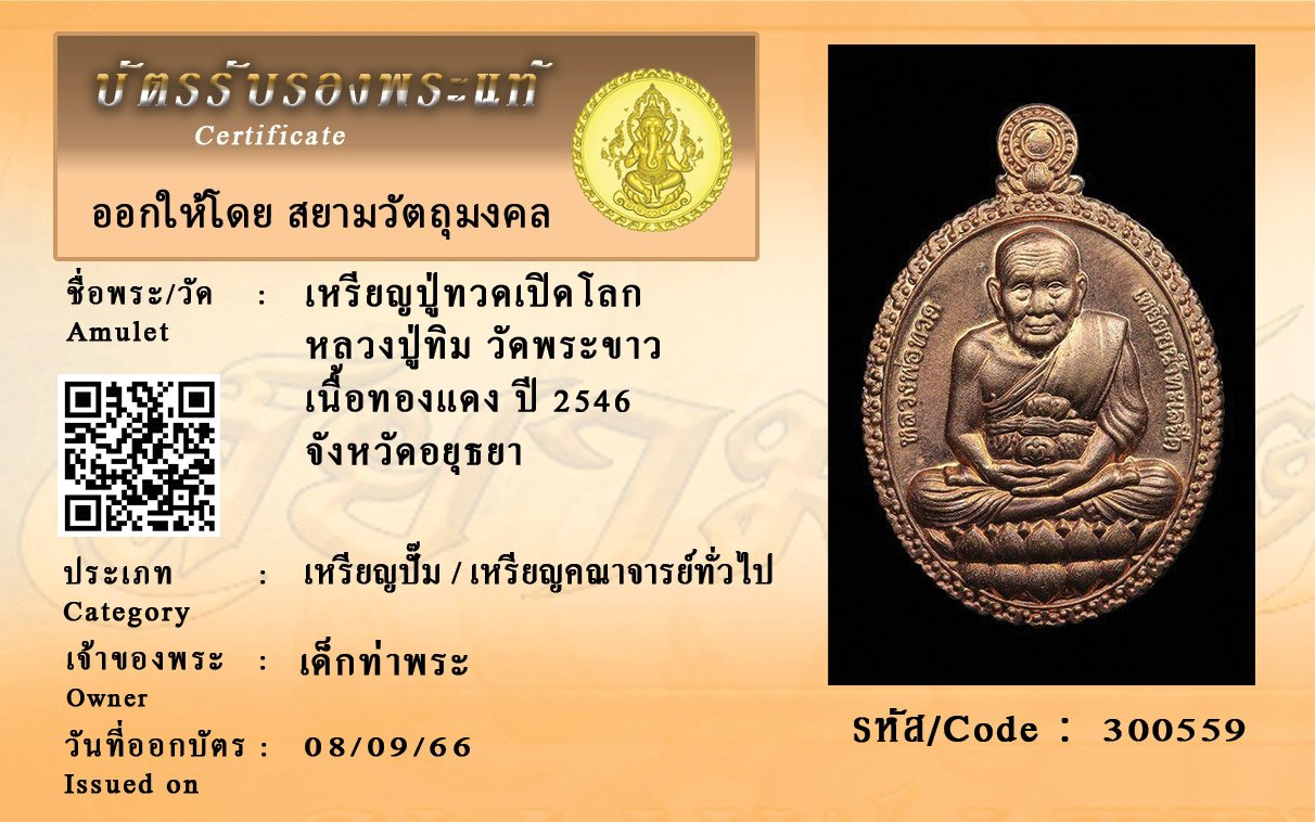 รหัสสินค้า : 300559 เหรียญปู่ทวดเปิดโลก หลวงปู่ทิม วัดพระขาว เนื้อทองแดง ปี 2546 จังหวัดอยุธยา